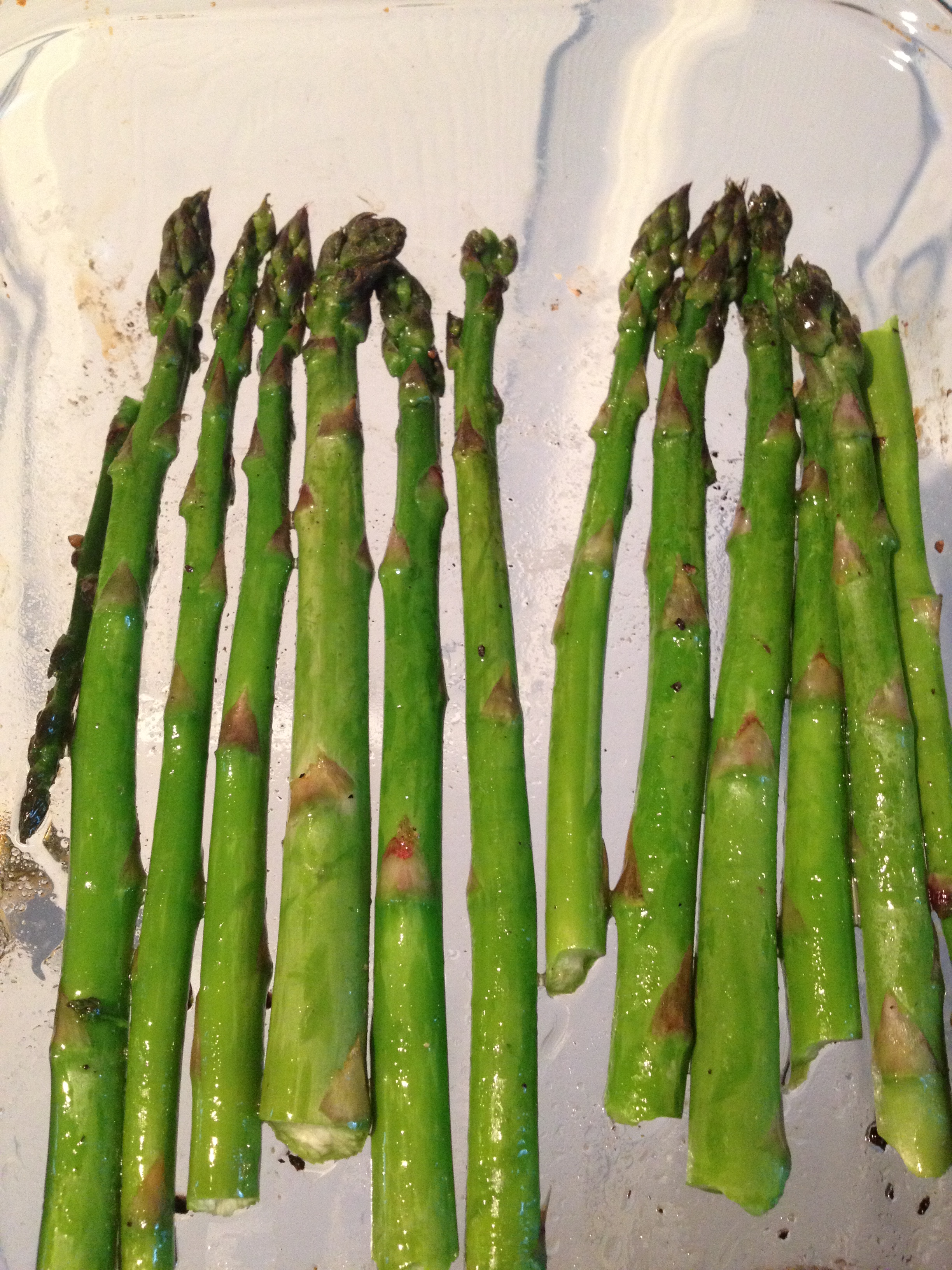 - Place in oven for a couple of minutes to melt coconut oil. Stir asparagus so each spear is coated with the melted oil