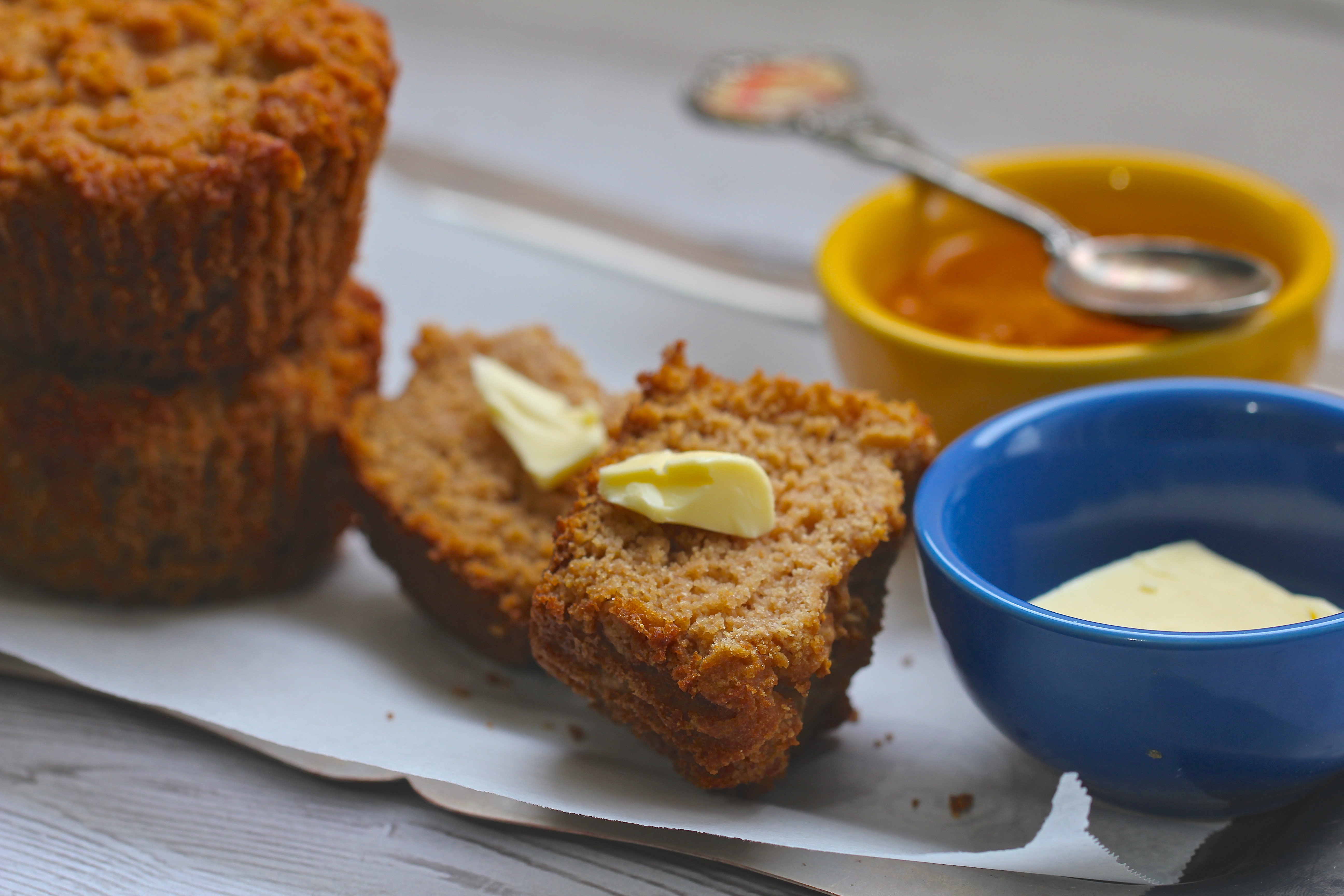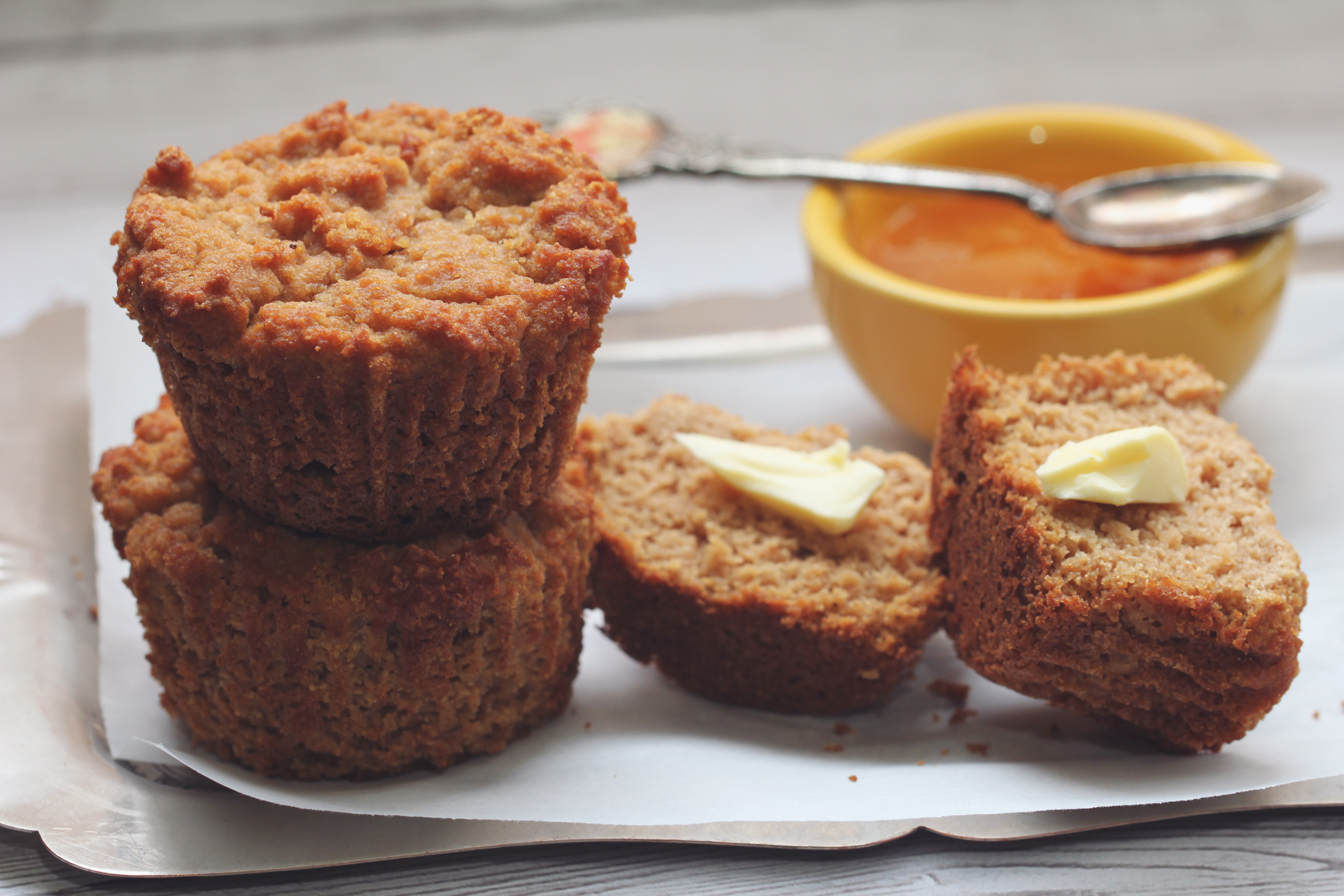 After cooling, I sliced the muffin in half and slathered on some grass-fed butter which I have been trying to work into my diet. Coconut oil would be fabulous too! I also drizzled on some fresh-squeezed lemon.